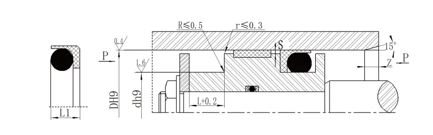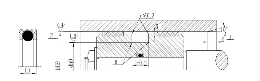 | एपर्चर रेंज D H9 | नाली व्यास D H9 | नाली चौड़ाई एल+0.2 | सील ऊंचाई एल 1 | गोल कोनों आरमैक्स | रेडियल क्लीयरेंस एसअधिकतम | नाला जेडमिन | ओ-रिंग वायर व्यास डीO | |