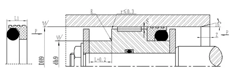 | एपर्चर रेंज मानक प्रकार D H9 RC2062 | एपर्चर रेंज भारी प्रकार D H9 RC2062-Z | नाली व्यास D H9 | नाली चौड़ाई एल+0.2 | सील चौड़ाई l1 | गोल कोने rअधिकतम | रेडियल क्लीयरेंस एसअधिकतम | नाला जेडमिन | ओ-रिंग वायर व्यास | ||